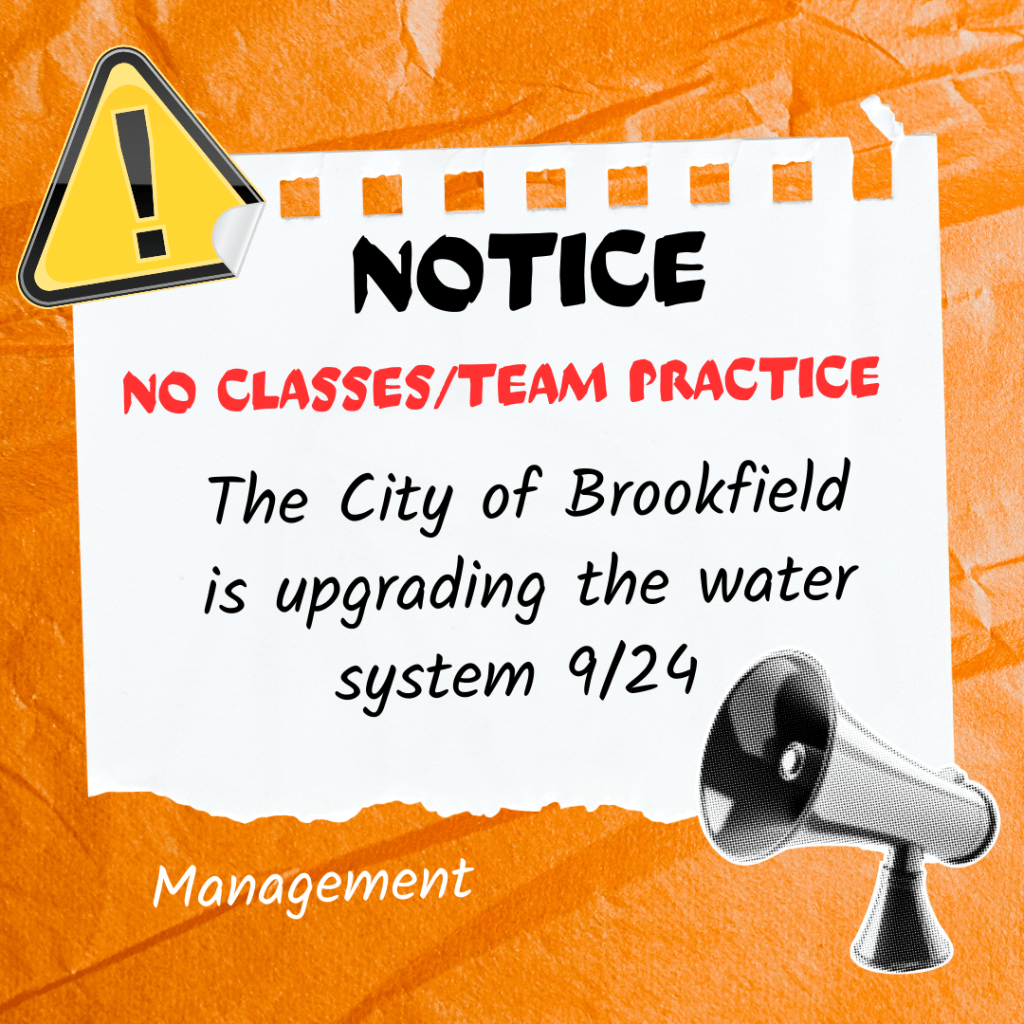 The city of Brookfield is making upgrades to the water system. Water will be shut off during this time. Morning classes will still run They have a tentative rain date of Wednesday 09/25. Follow the blog to stay notified of any changes.