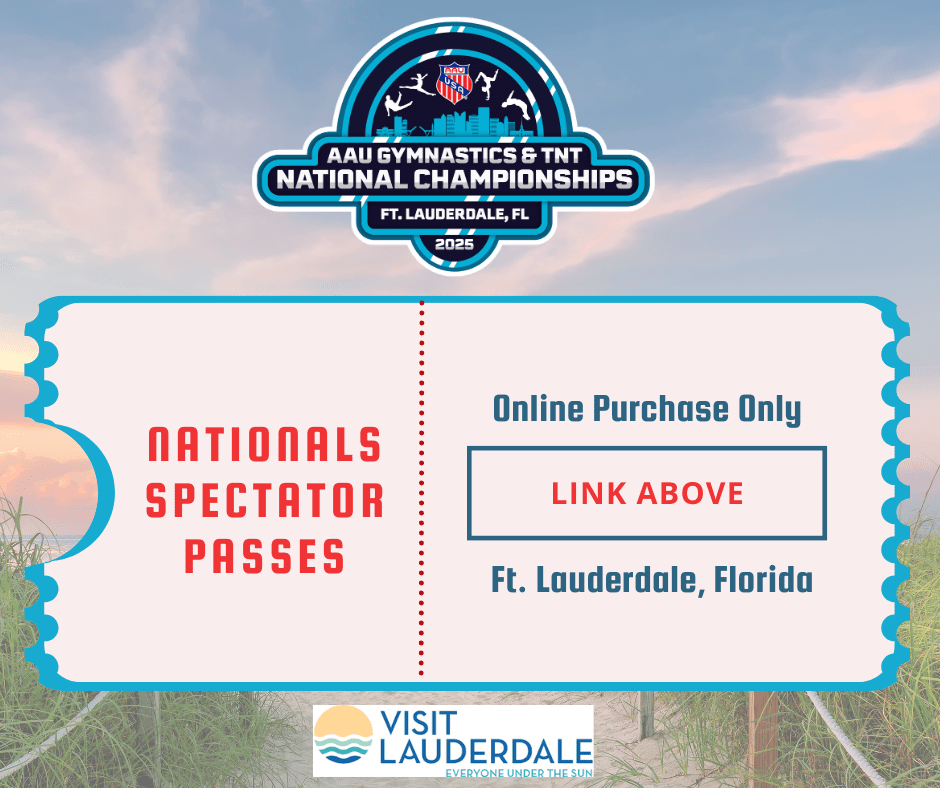 If you are going to AAU Nationals, you will need to purchase a spectators pass. We do not have the schedule yet, and it asks you to pick a day, but we wanted you to be aware that this has changed this year. The spectator passes will apparently be online only. We will let you know once we have the schedule. Here is the link: https://aausports.ticketspice.com/2025-aau-gymnastics-nationals-spectator-passes