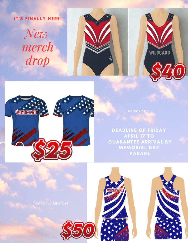 A stunning red, white, and navy leotard featuring sharp, eye-catching lines and sparkle details that command attention A unisex tee with a dynamic star-spangled design and bold “WILDCARD” lettering—perfect for everyday wear A matching tank and leo set that brings movement and flair with sweeping stripes and star patterns